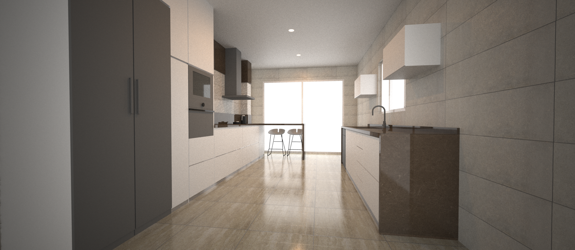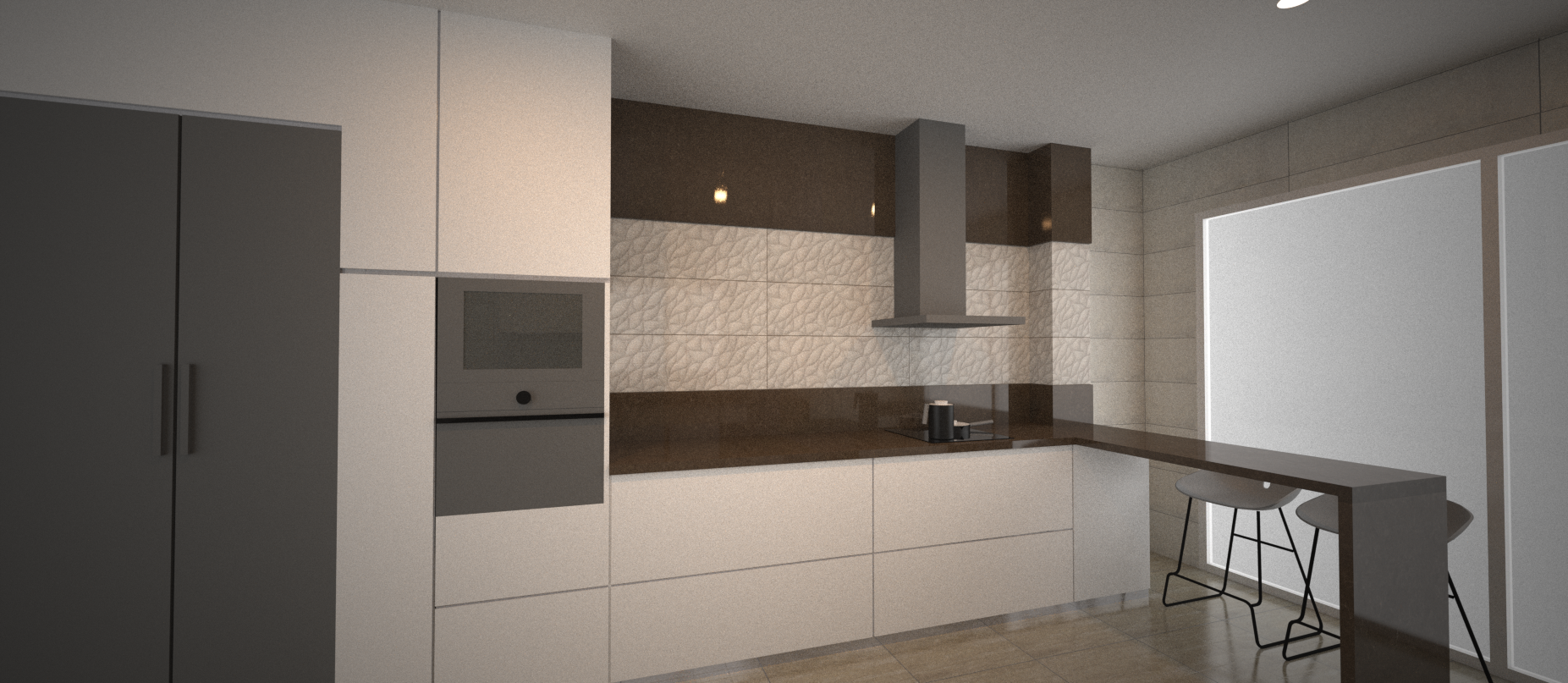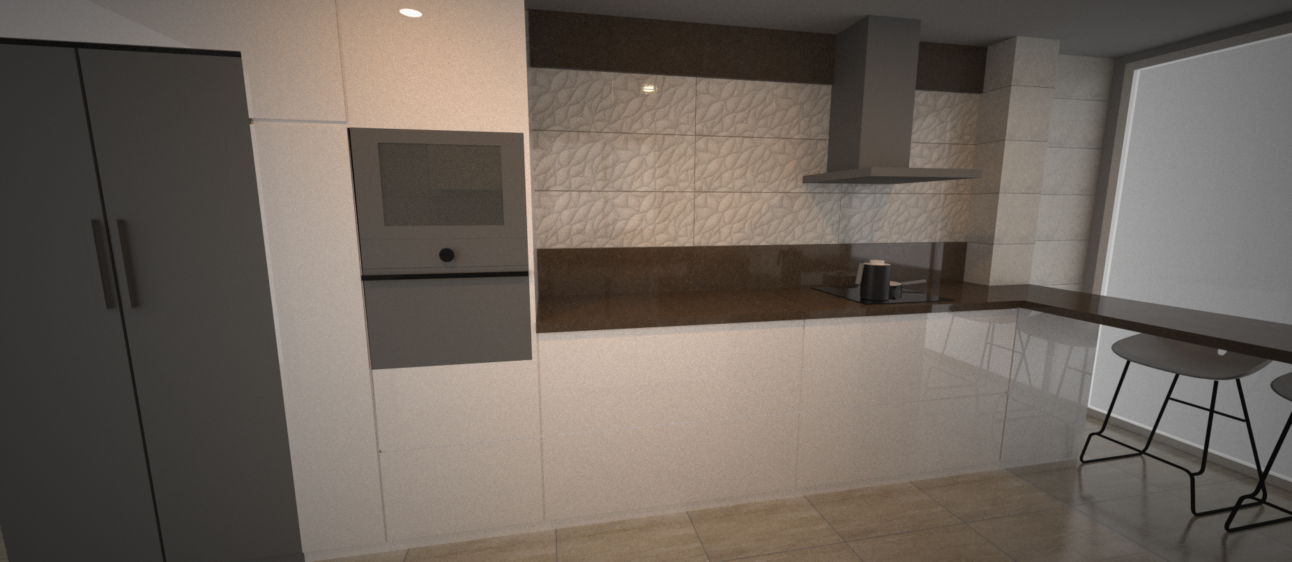 Se eligieron tonos claros tanto en el mobiliario como en los azulejos, para darle así mayor protagonismo a la bancada y creando una zona office ideal para desayunos y comidas rápidas
