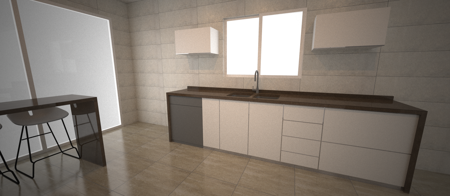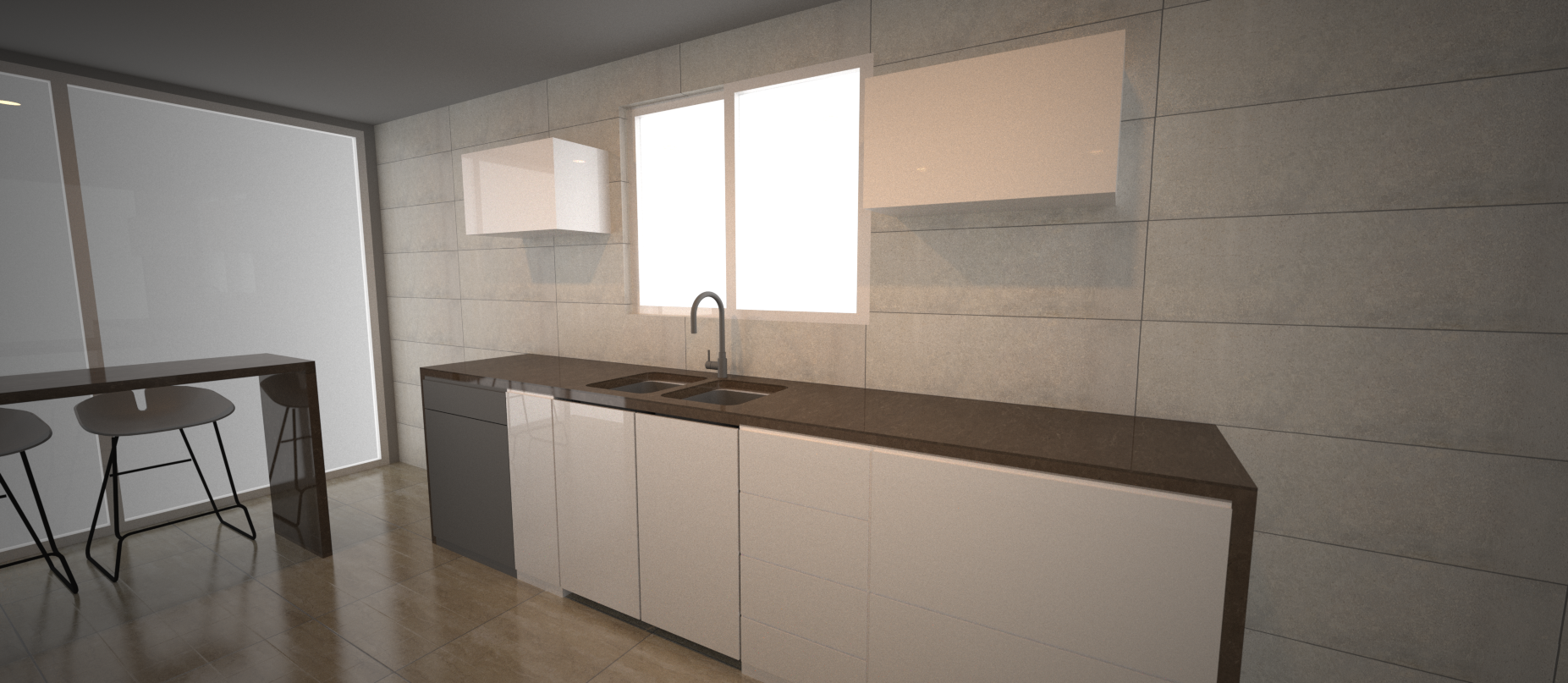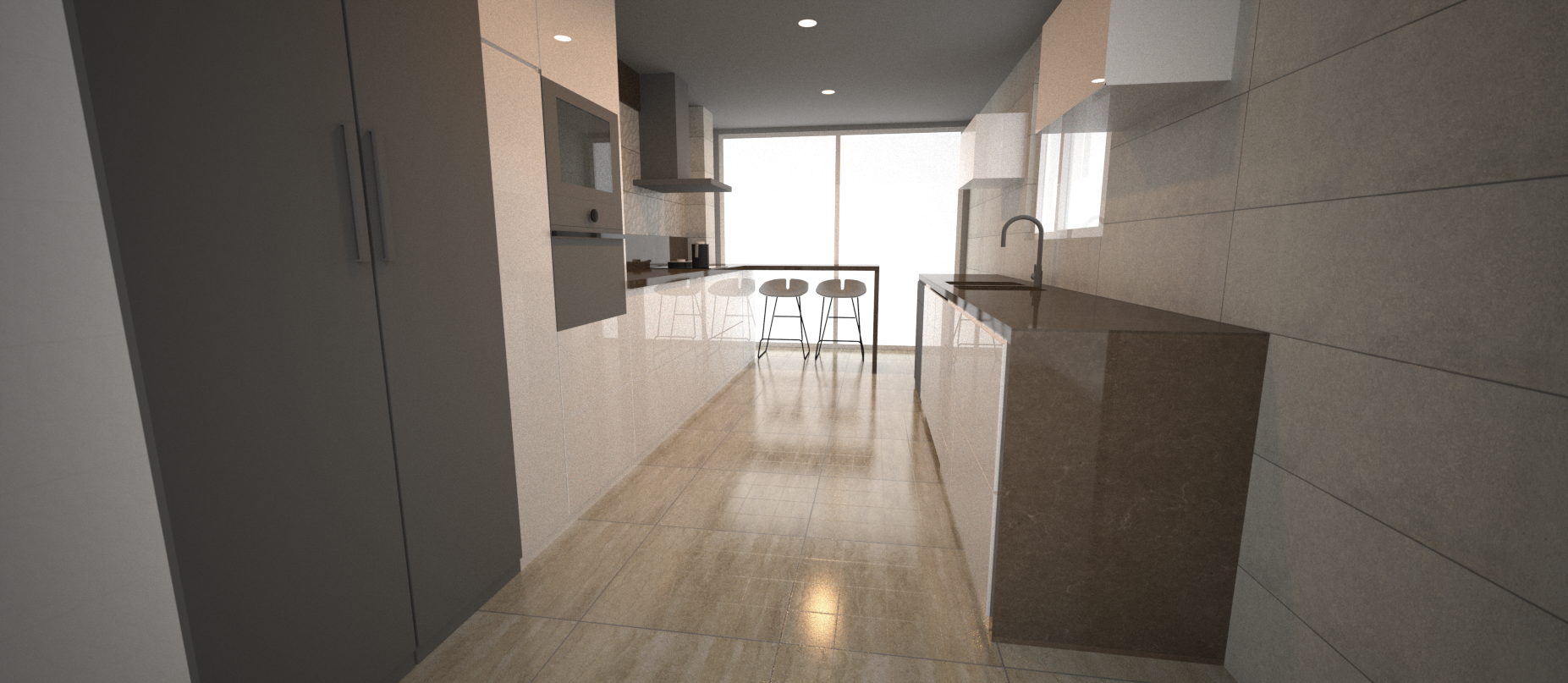 Se eligieron tonos claros tanto en el mobiliario como en los azulejos, para darle así mayor protagonismo a la bancada y creando una zona office ideal para desayunos y comidas rápidas