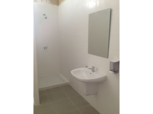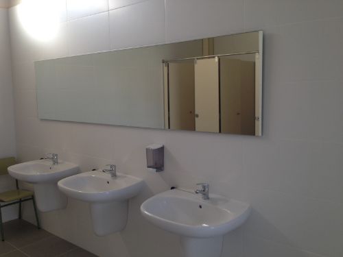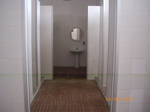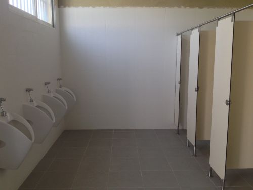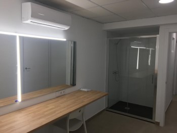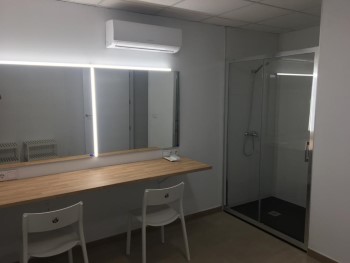 La fontaneríade las duchas es empotrada , el saneamiento suspendido, el pavimento antideslizante y las mampara fenólicas
